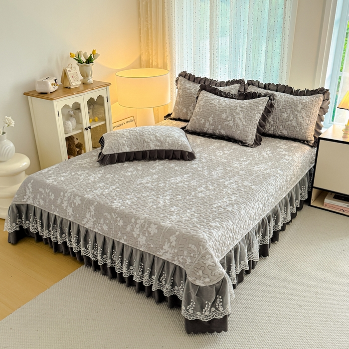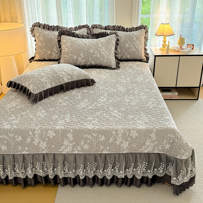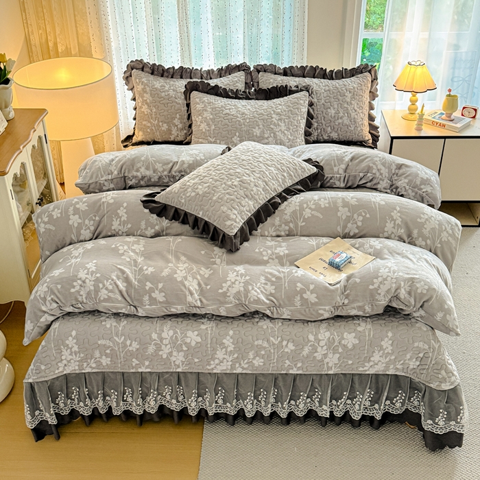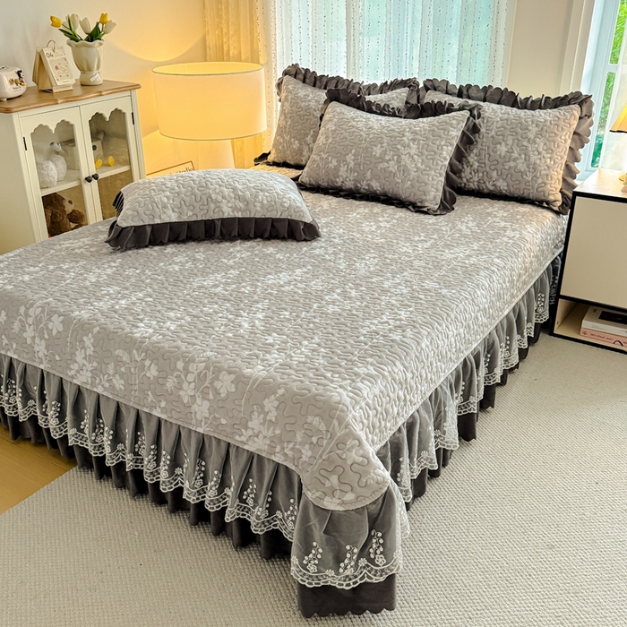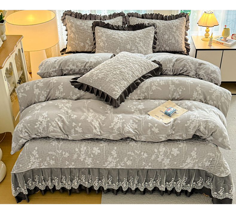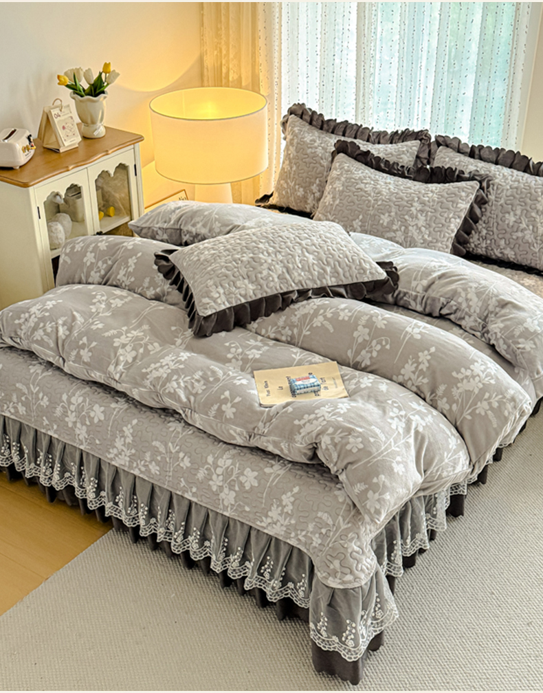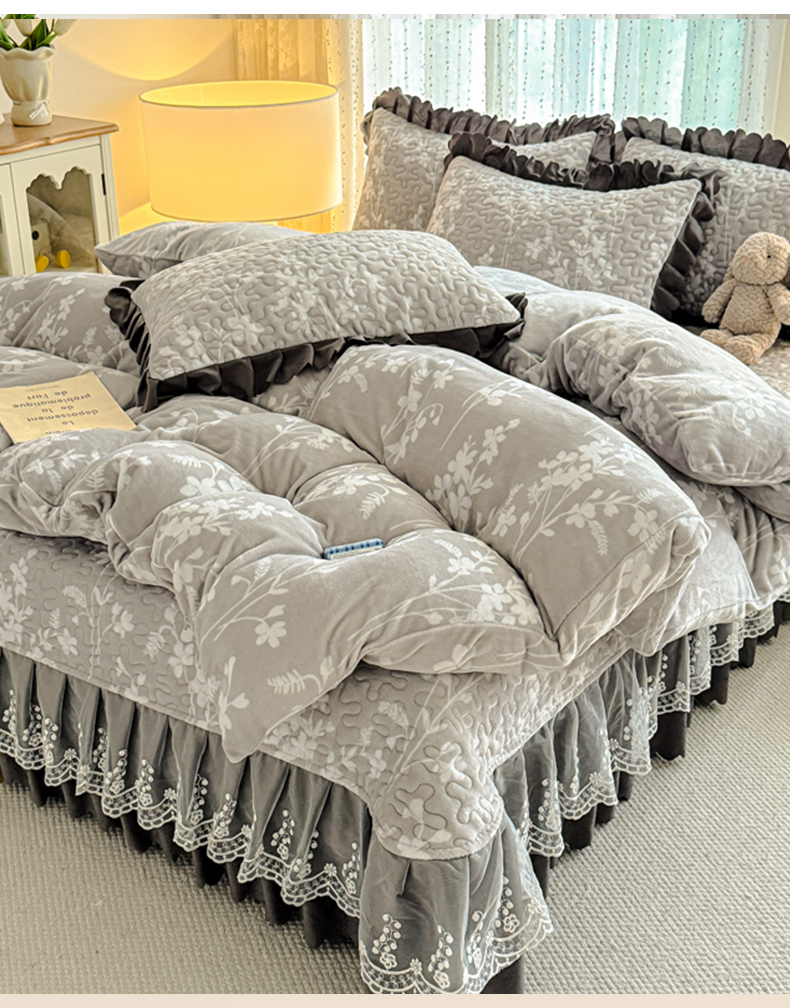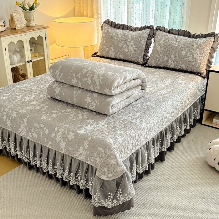 双层蕾丝花边印花牛奶绒床盖四件套