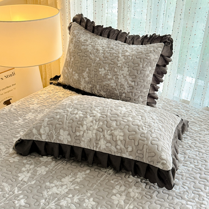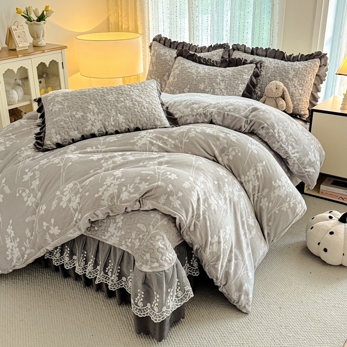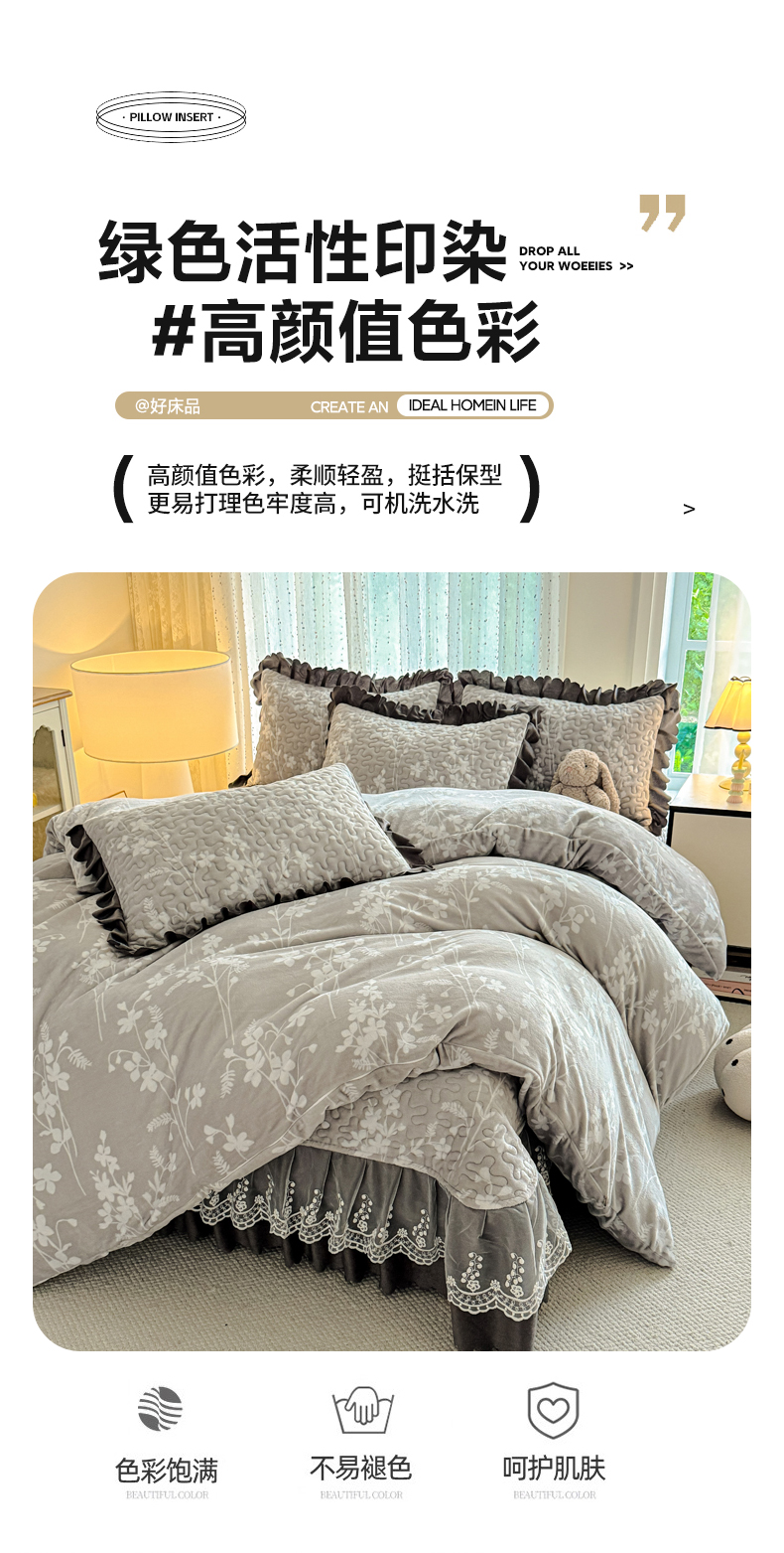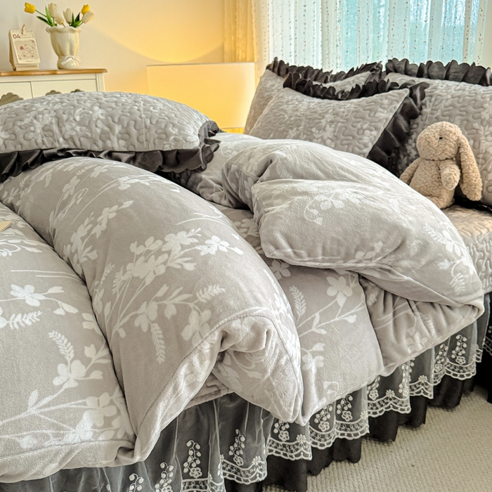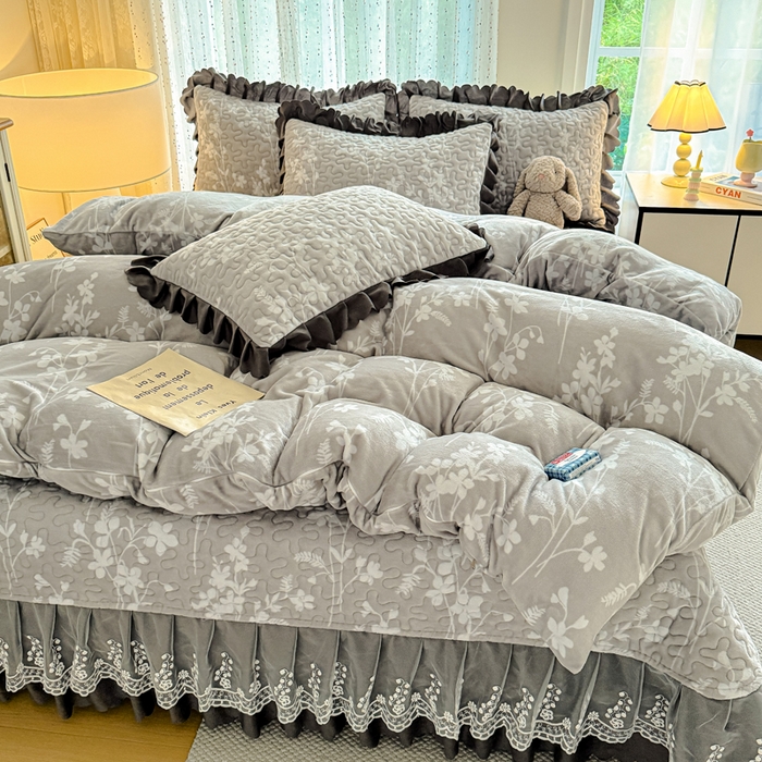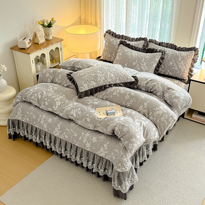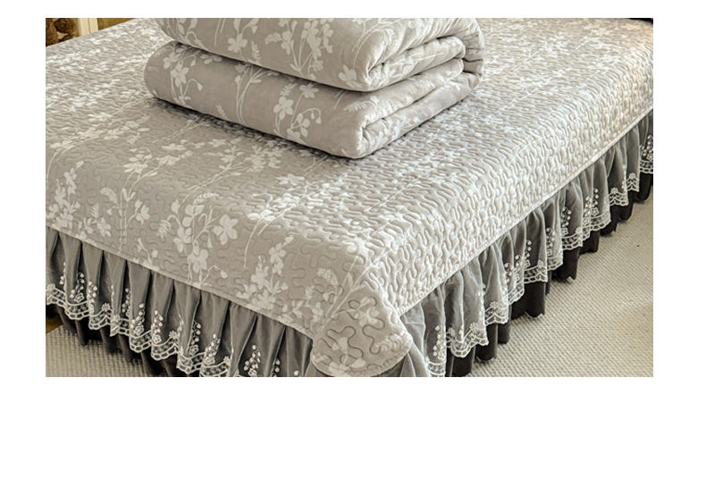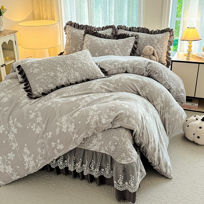 双层蕾丝花边印花牛奶绒床盖四件套