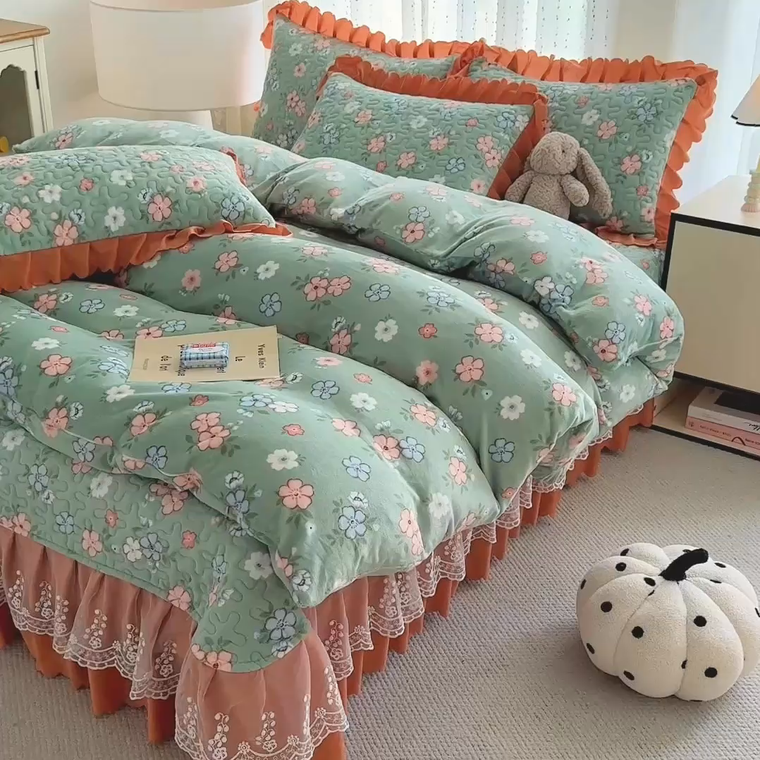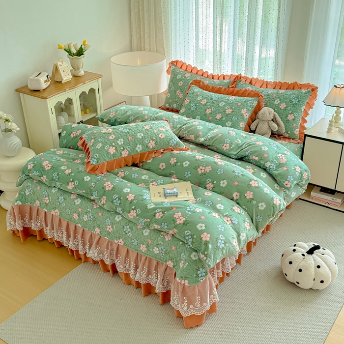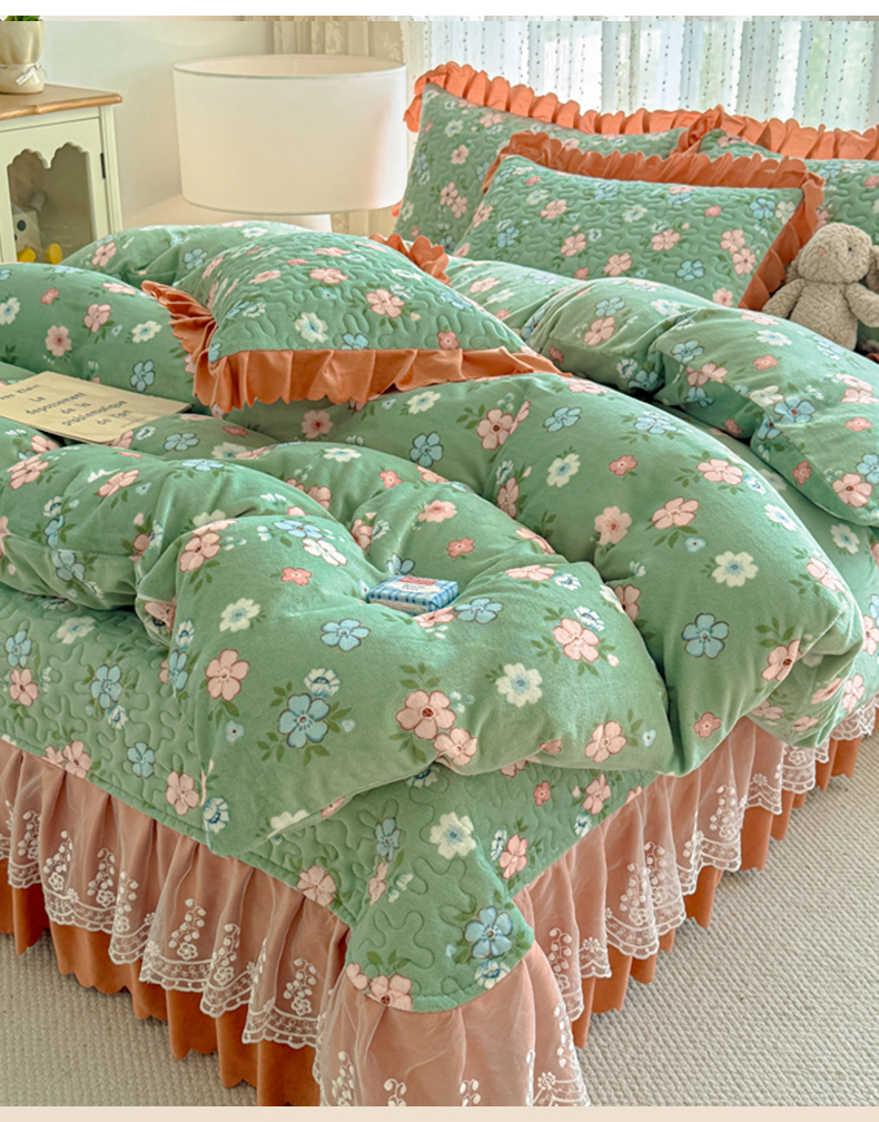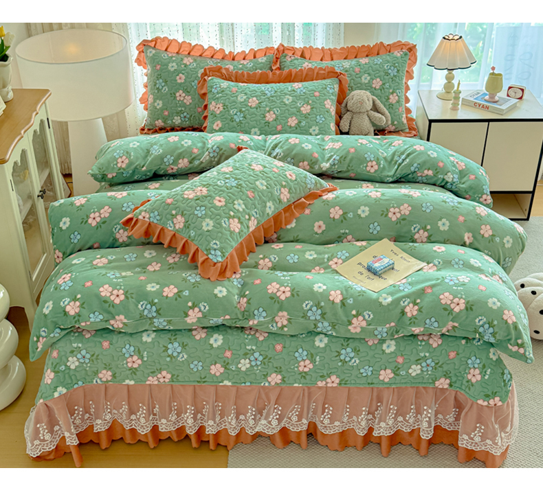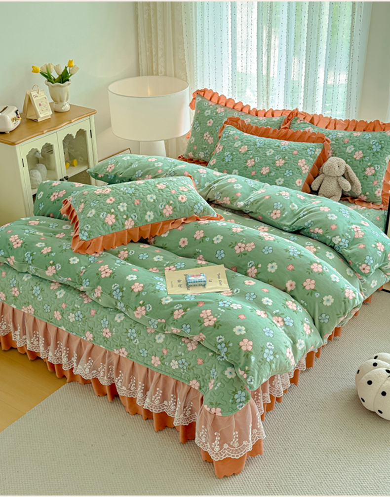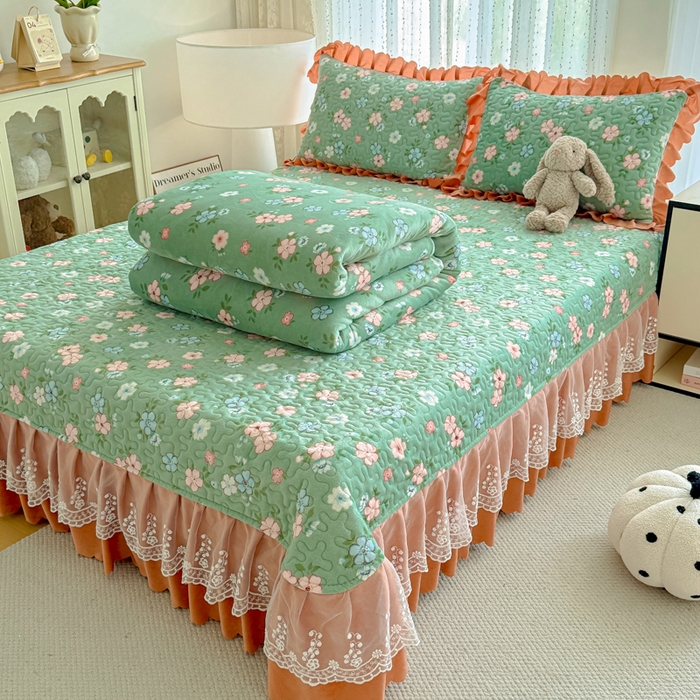 双层蕾丝花边印花牛奶绒床盖四件套