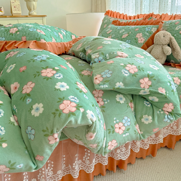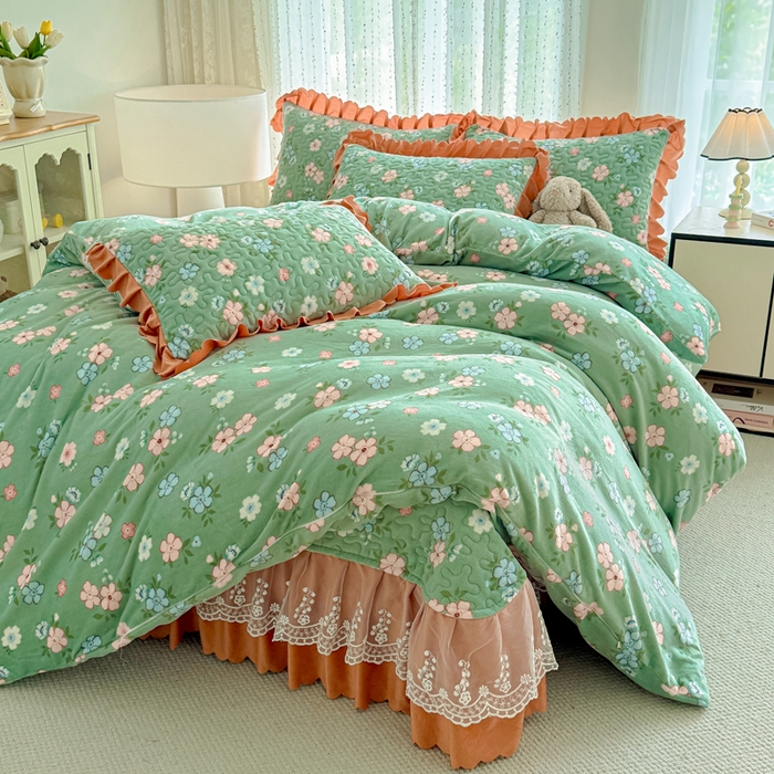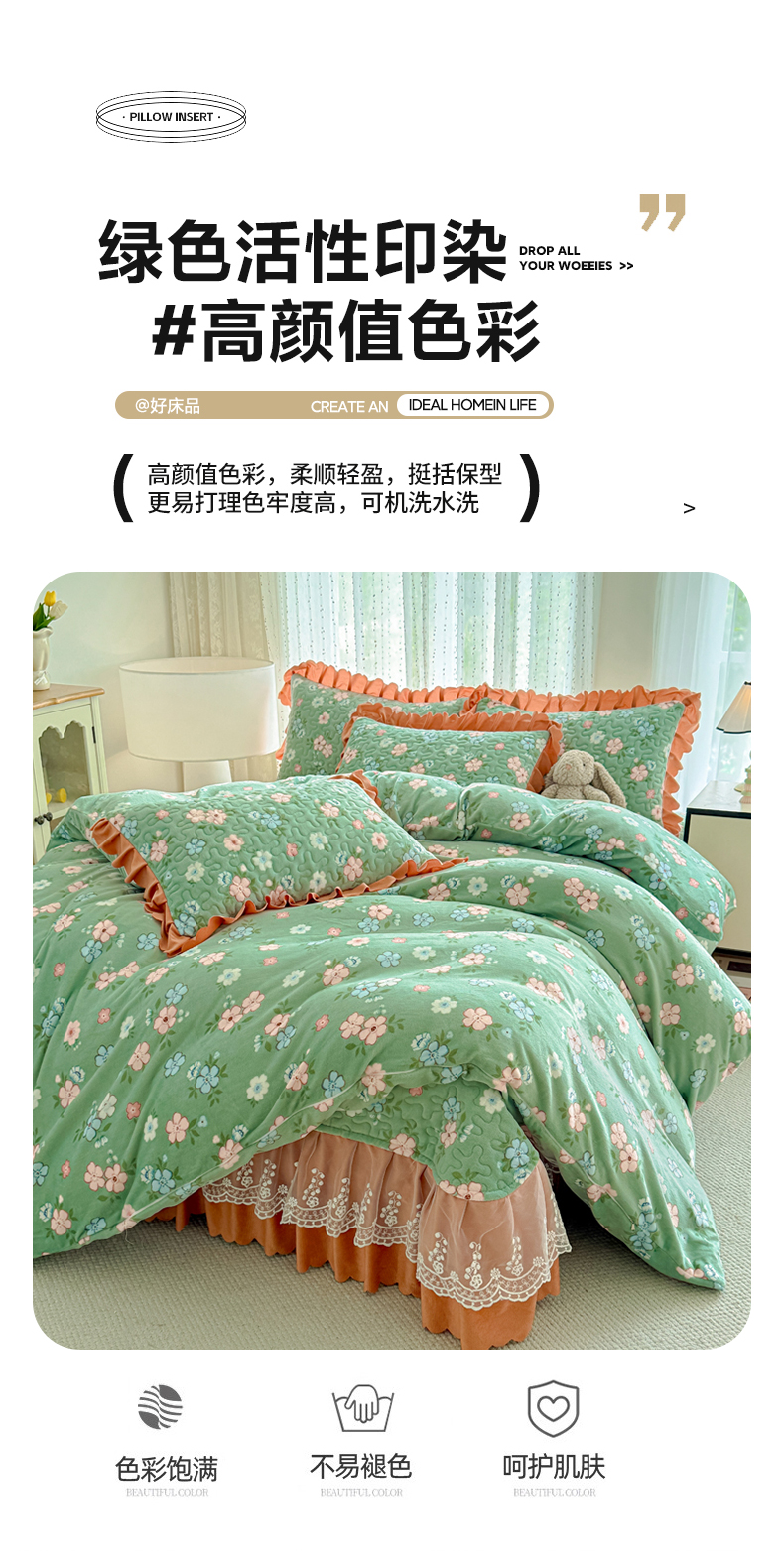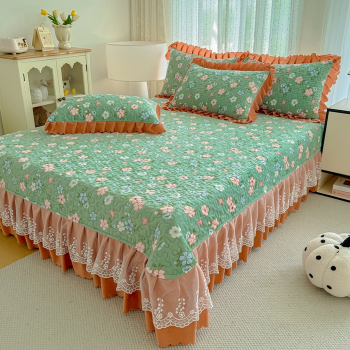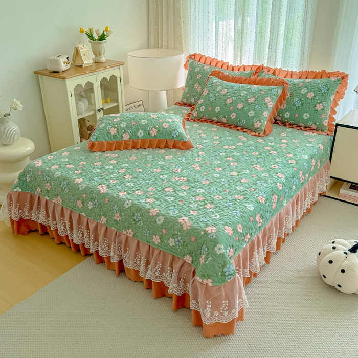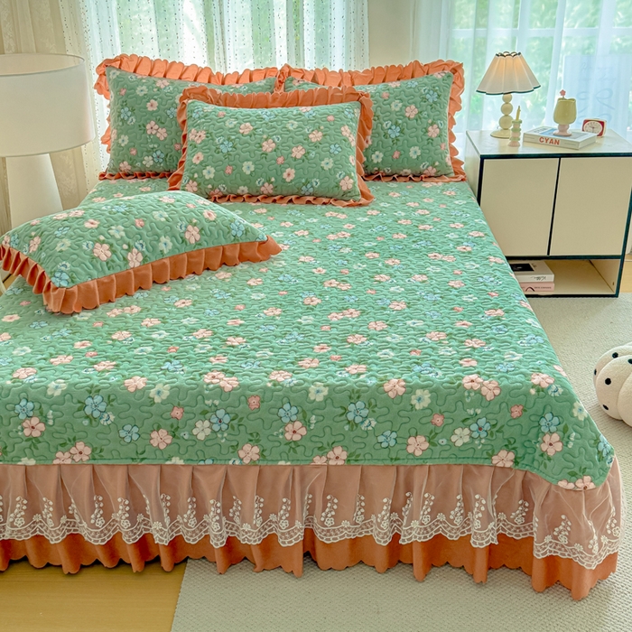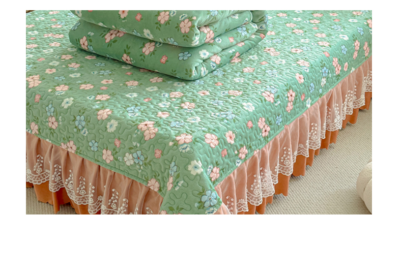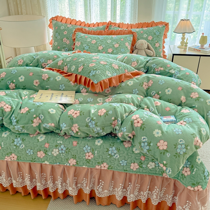 双层蕾丝花边印花牛奶绒床盖四件套