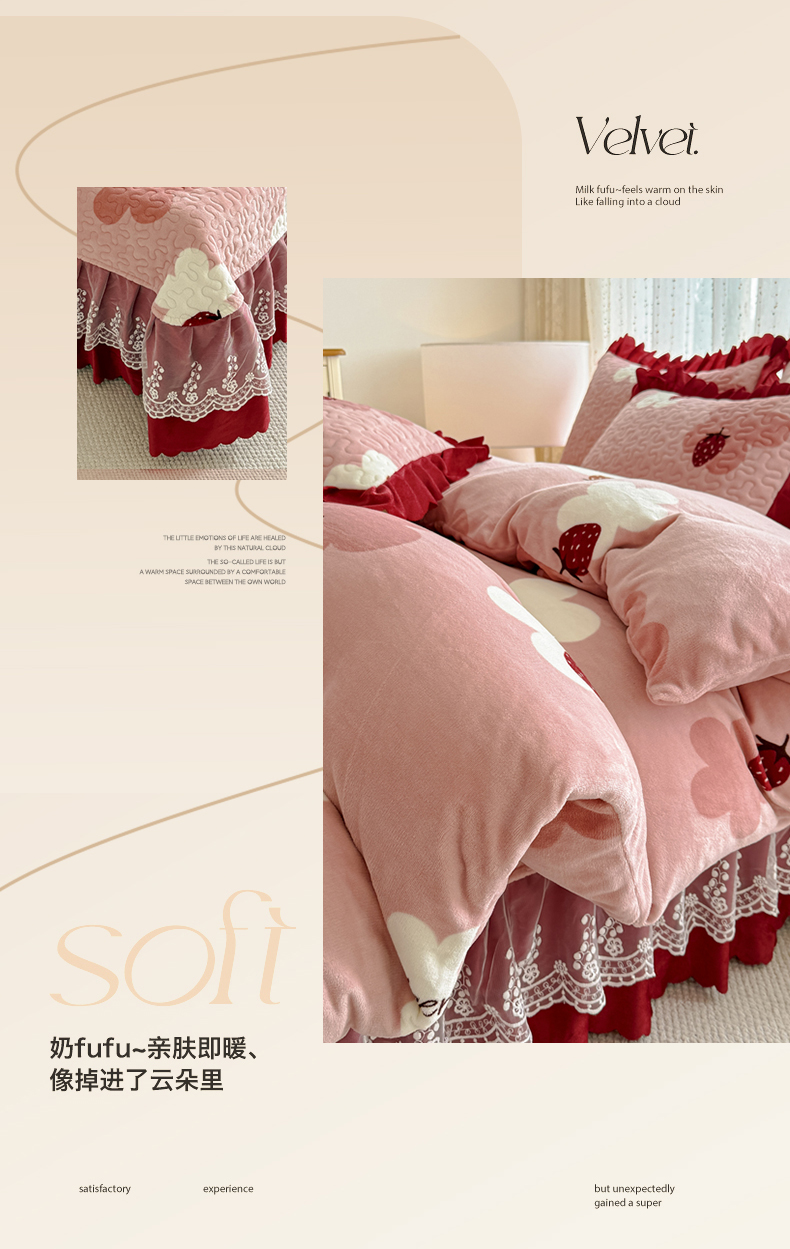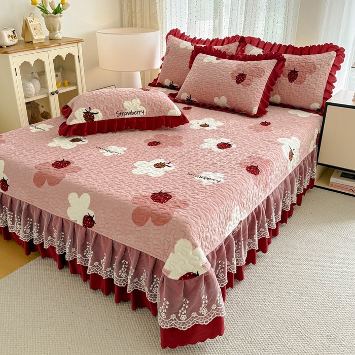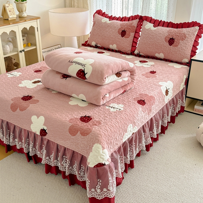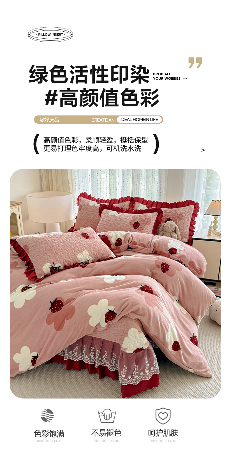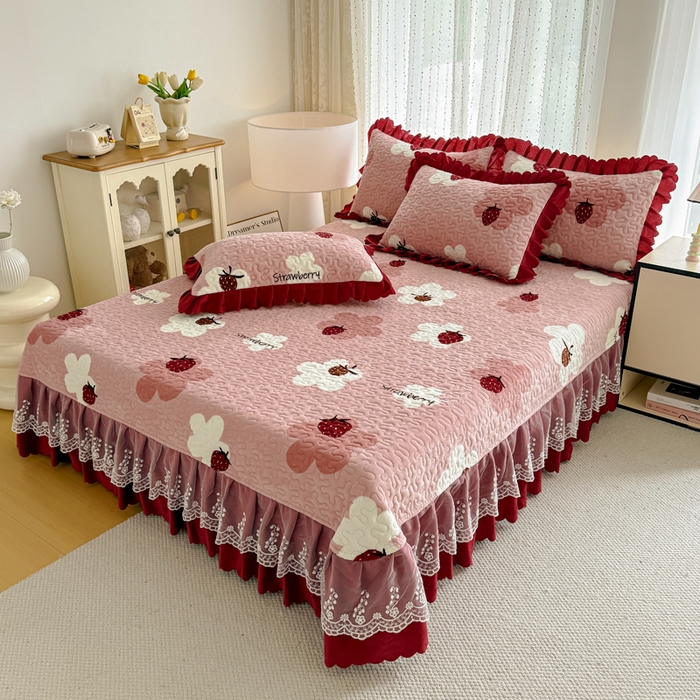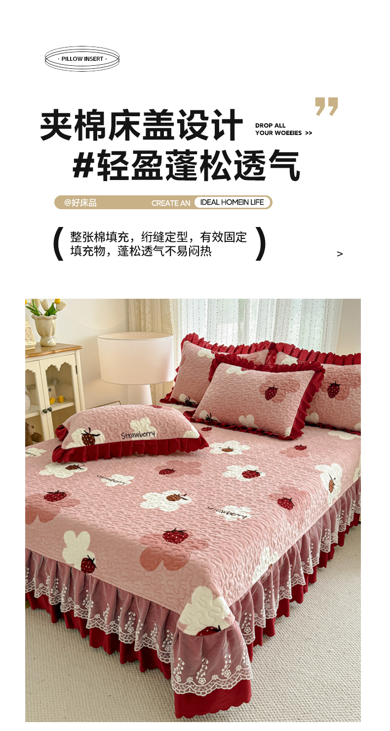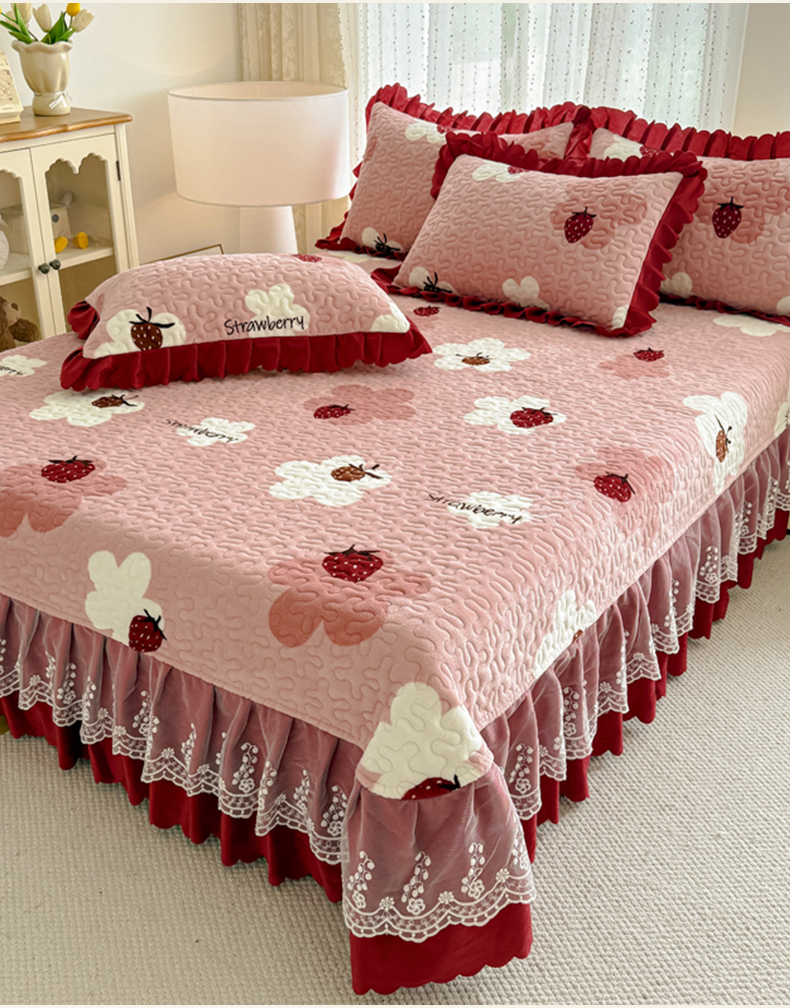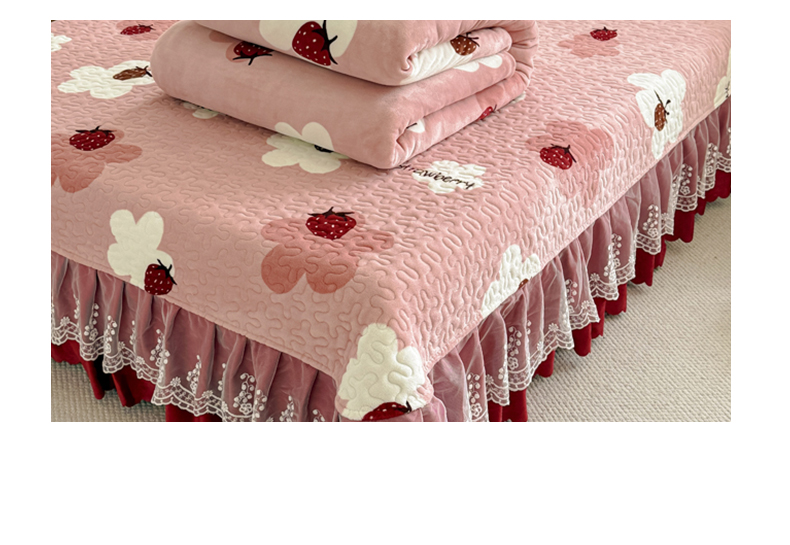 绒耀 2025新款直播爆款双层蕾丝花边牛奶绒印花床盖四件套床盖单件三件套 红粉佳人