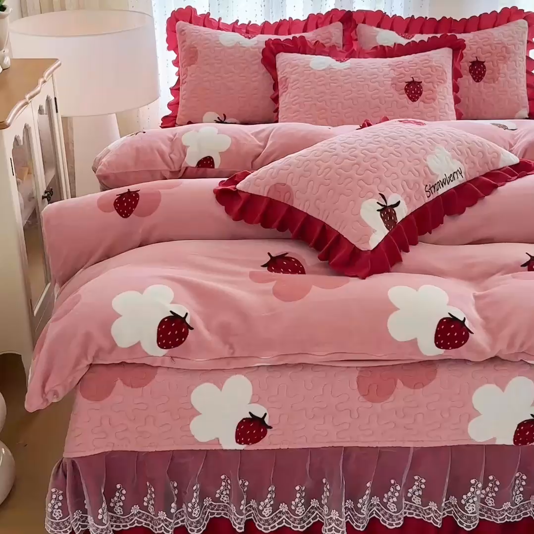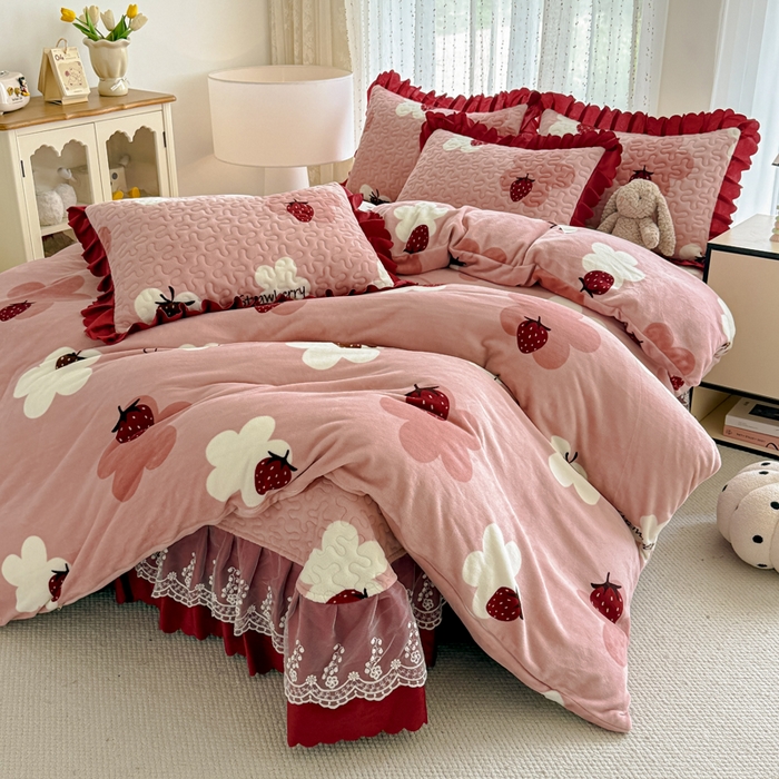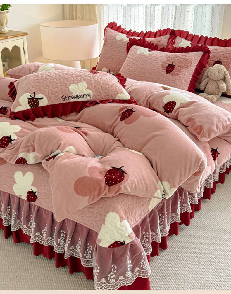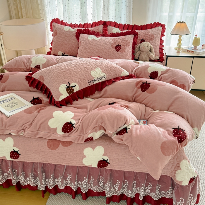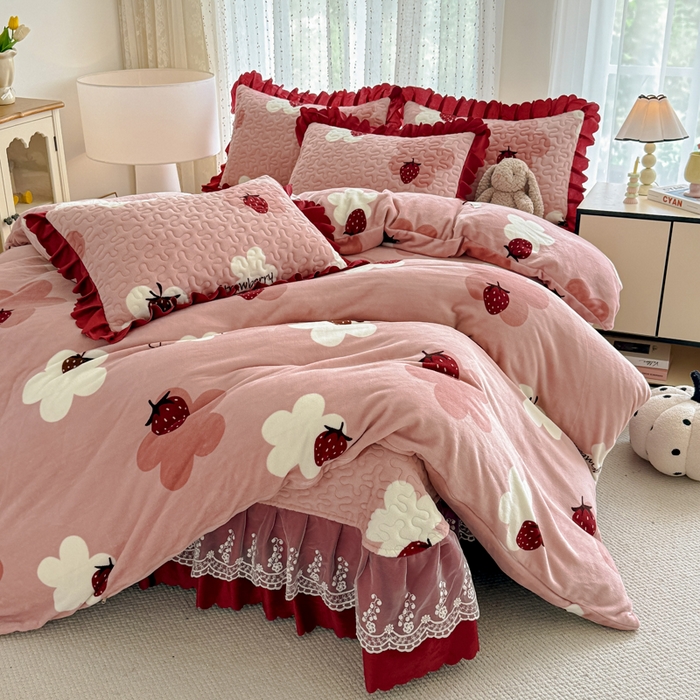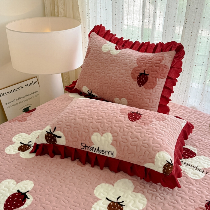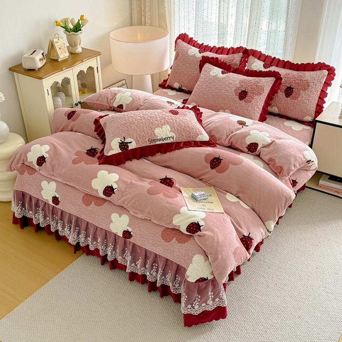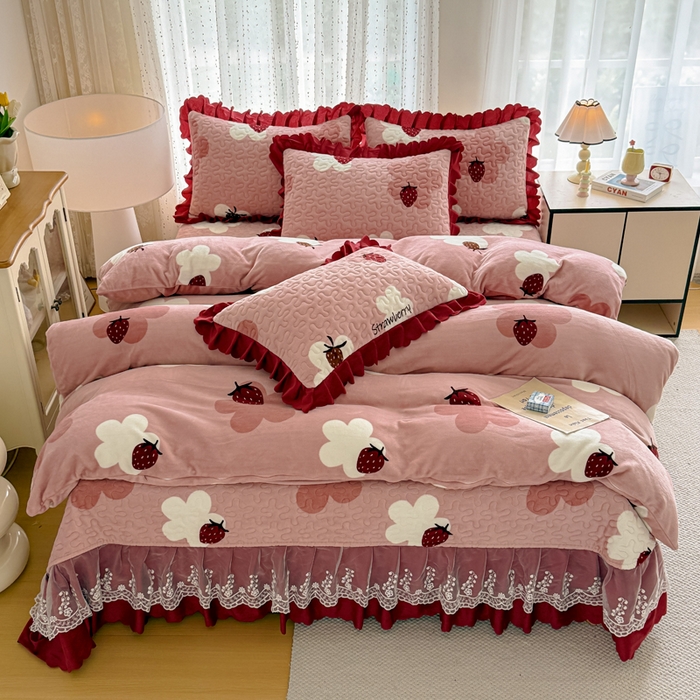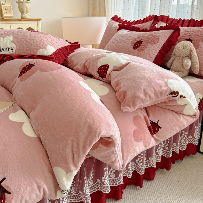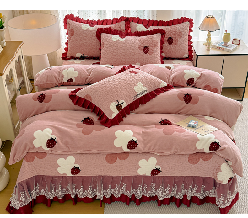 绒耀 2025新款直播爆款双层蕾丝花边牛奶绒印花床盖四件套床盖单件三件套 红粉佳人